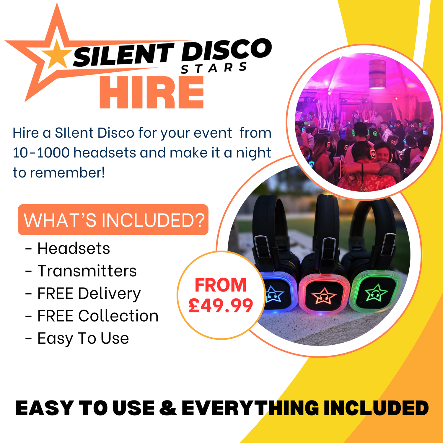 Get the party started with Silent Disco Hire Stars! Our systems arrive ready to go straight out of the box, packed with everything you need for an unforgettable night of singing, dancing and fun with the best quality and incredible sounding LED headsets.