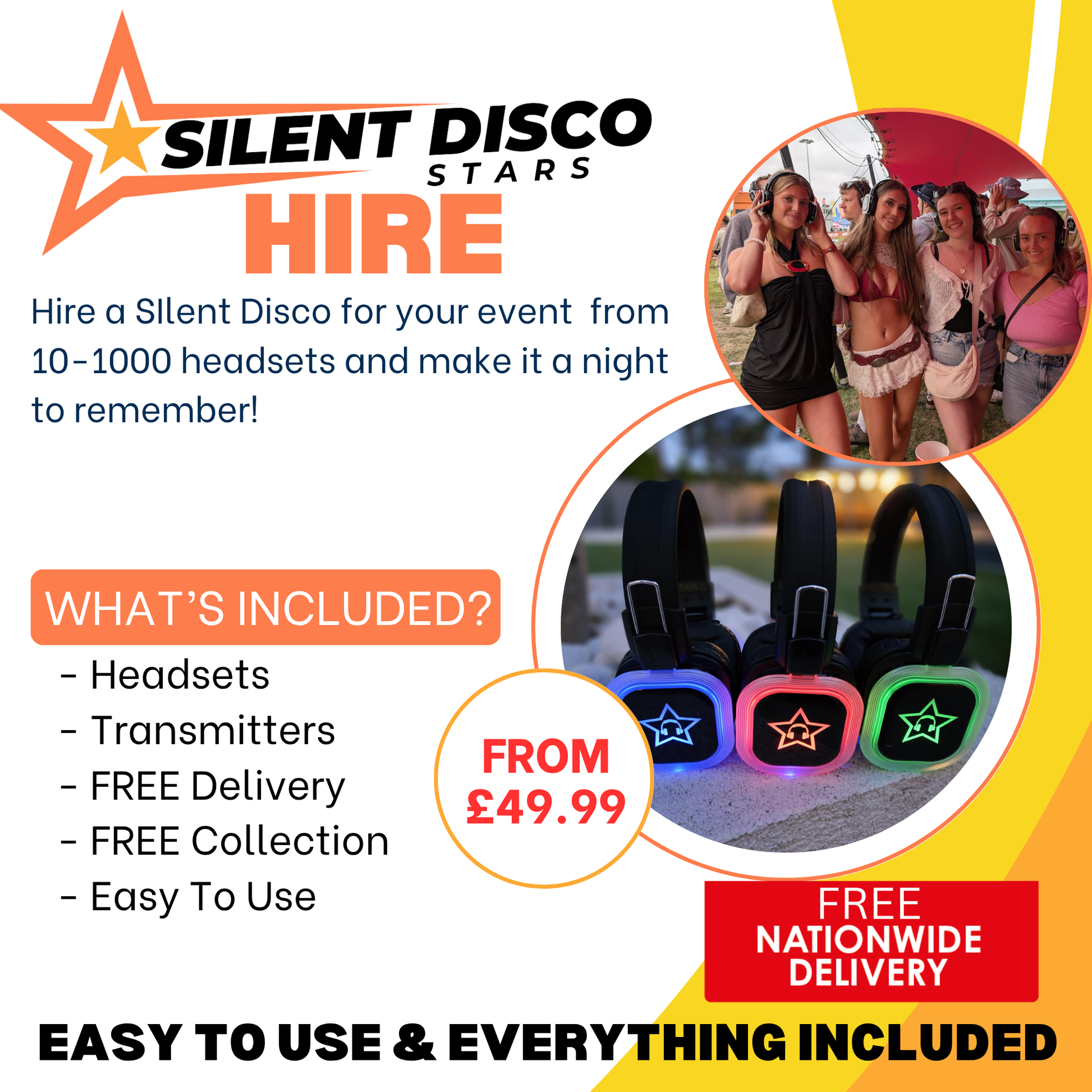 Silent Disco 10 to 500 Headset Package: Get ready to take your party to the next level with our Silent Disco Headset Packages! This set includes 10 to 600 high-quality wireless headphones that deliver crystal-clear sound, if you need more than 600, please contact us for a bespoke quote. This Package also comes with 2 transmitters, meaning you can easily switch between different music options.