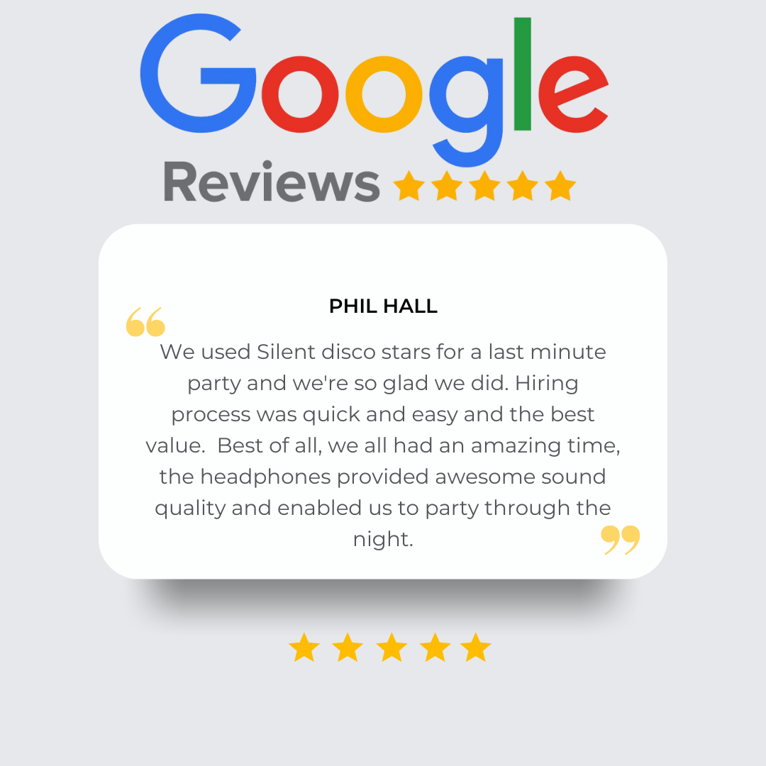 "Brilliant experience using the silent discos everything was really straight forward and we had a great time. Thanks so much! Highly recommend"